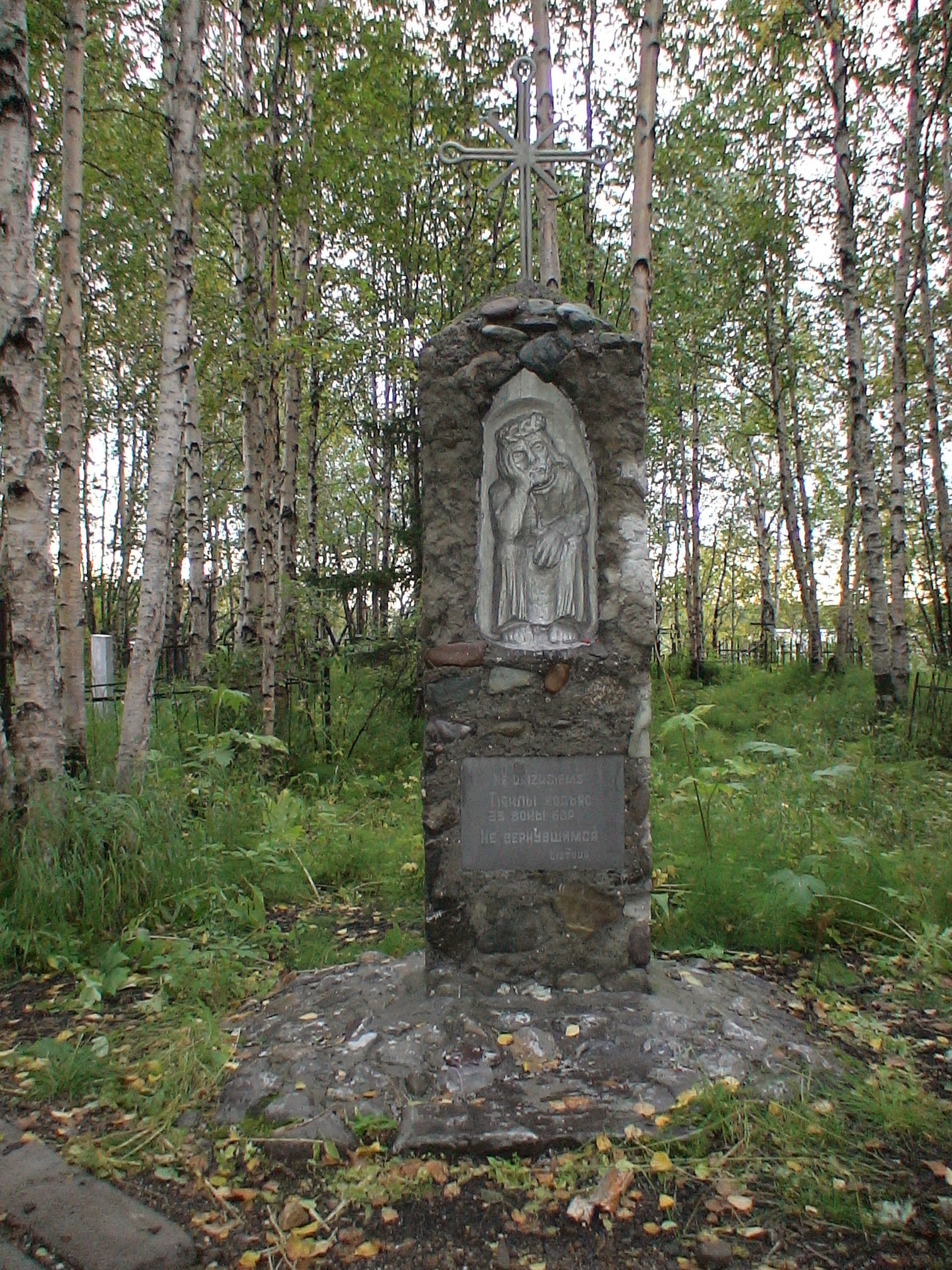 Восточное кладбище Интинского лагеря возникло в середине 1940-х при ОЛП №2, располагалось в 1,5 км от лагеря. Заключенных хоронили в индивидуальных могилах, на которых устанавливали столбики с номерами. Со второй половины 1950-х до середины 1960-х – городское кладбище, здесь хоронили жителей Инты, в том числе ссыльных, здесь же в братских могилах хоронили погибших горняков. В 1956 политзаключенные-латыши перед отъездом на родину установили на кладбище памятник погибшим землякам «Dzimtenei» («Родине»). Авторы памятника – скульптор Эдвардс Сидрабс, в это время еще заключенный, и бывший заключенный Адольф Пунтулис, который находился в Инте на «вечном поселении». Работы проводились тайно, памятник был отлит из бетона по частям и установлен в течение одной ночи. Открыт 29 июля 1956 в присутствии почти 200 человек, освящен латышским священником – заключенным Интинского лагеря; при открытии был исполнен национальный гимн Латвии. В 1962 кладбище было закрыто и заброшено. В 1989 инициативная группа с шахты «Восточная» привела в порядок территорию кладбища, восстановила сохранившиеся памятники. 18 августа 1990 по инициативе Вильнюсского общества политссыльных на кладбище открыт памятник «Rūpintojėlis» («Христос Скорбящий»), он был освящен епископом Казимиром Василяускасом, бывшим заключенным Интинского лагеря. Скульптор – Ионас Юодишюс, сын бригадного генерала И.Юодишюса, погибшего в заключении в Абези. Надпись на табличке на литовском, коми и русском языках: «Ne csižusįems. Тiянлы, кодъяс эз воны бöр. Не вернувшимся. Lietuva».
